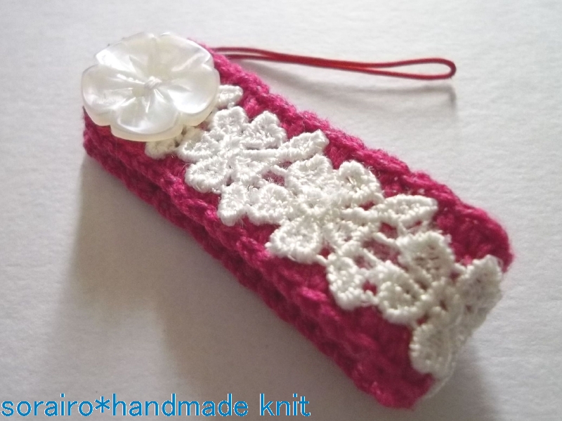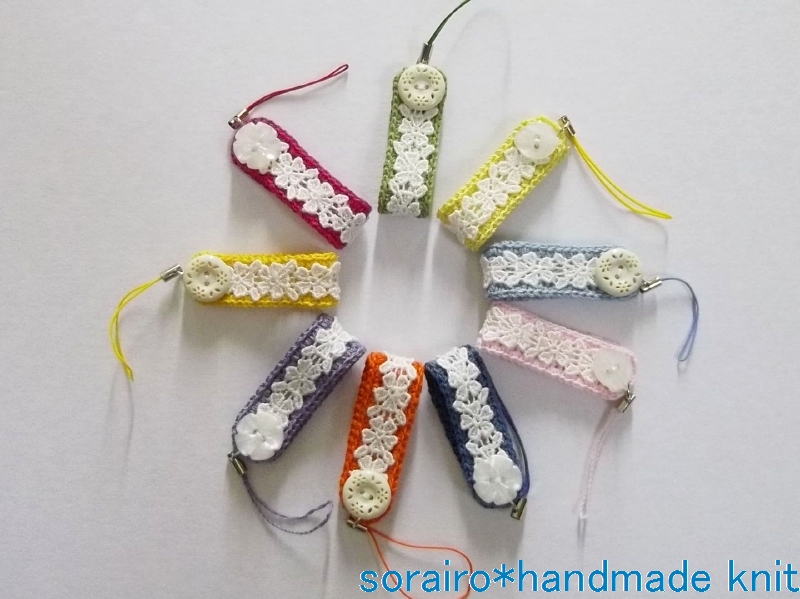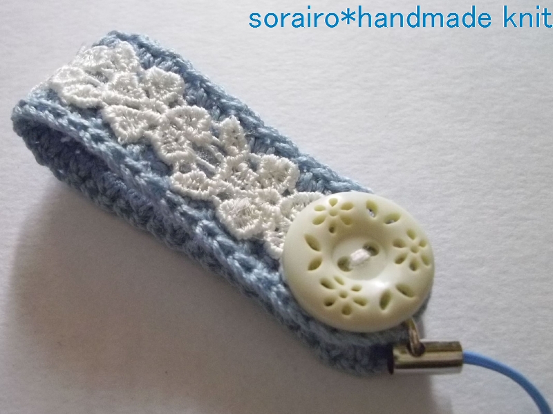 ニットも、すっかり衣替え・・・といいますか、いかにも涼しげな感じのものをと思い、レースを使ったストラップを作ってみました。きれいめの色の糸で、ストラップのカタチを編み、その上に優しいデザインのレースを乗せてみました。