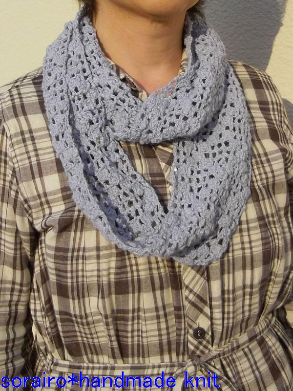 そんなときに重宝しそうなのが、コットンの糸で編んだスヌード。コットンといっても、白地にブルーやグレーのネップが入った、太目のスラブ系の糸を使用しているので、けっこう温かさもあって、かなり長い期間使えそうです。
