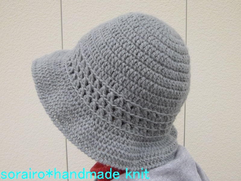 写真では、本当の色がうまく出ていませんが、青っぽいグレイ系の渋いお色目で、広めのブリム(つば)の上には、長編みを交差させたものを3段編んで、アクセントにしました。