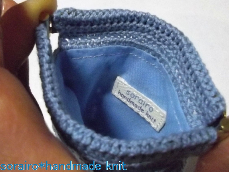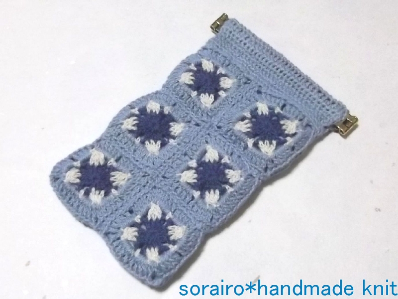 袋の部分は輪編みで、ぐるぐる編んで、フタの部分は、折り返して編みました。キツめにかっちりと編んであります。